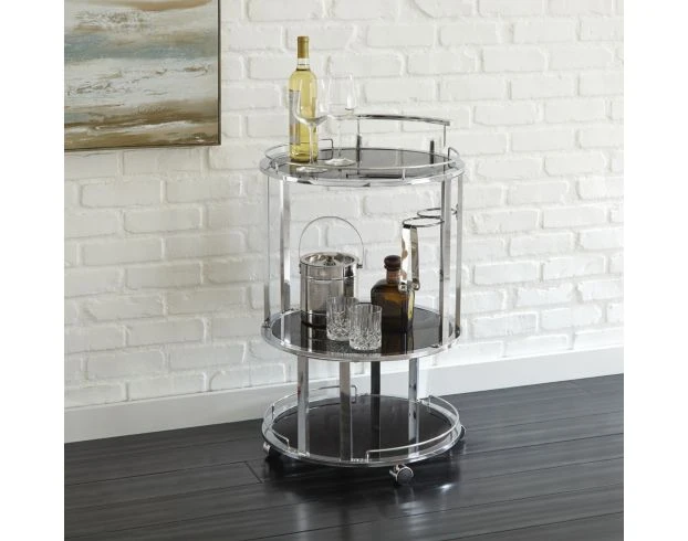 Blend modern styling with functionality with the Steve Silver Otero Server Cart. The two-tiered cart offers glass shelving with chrome highlights and caster for smooth mobility. Use this piece to serve food or drinks during your next party to impress your guests.
