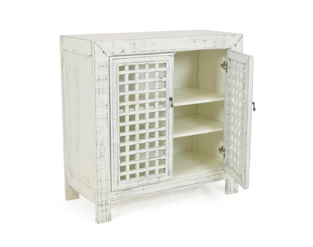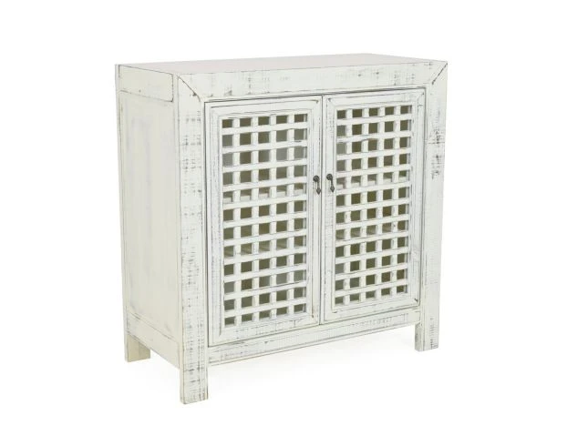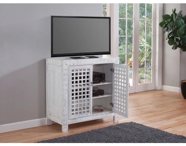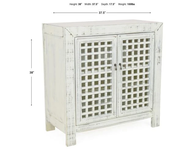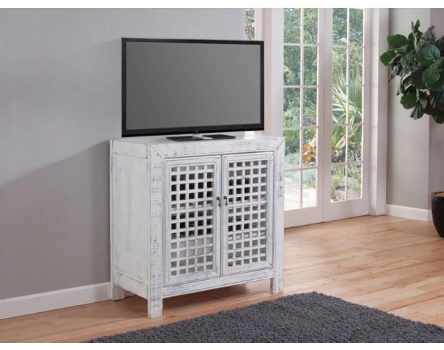Introducing the Steve Silver Rio White Accent Cabinet, a perfect blend of vintage charm and modern functionality. Inspired by the classic Pie Safes of yesteryears, this cabinet is thoughtfully designed to fit seamlessly into today’s rooms. Its lattice work front not only adds a touch of elegance but also provides a practical solution for organizing and accessing your remotes with ease. Embracing a farmhouse style, the Rio Accent Cabinet is a delightful addition to casual décor. Its distressed, hand-rubbed white finish exudes a timeless appeal, while the neutral accent adds a pop of character to any room.