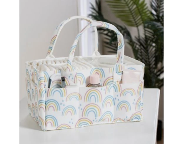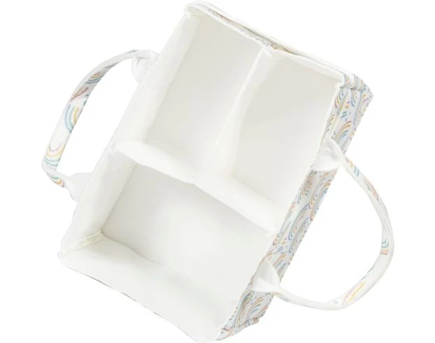 Our soft and sturdy Painted Rainbow felt storage caddy is designed to keep diapers, wipes and changing items organized. Sturdy felt handles allow the caddy to be easily moved from room to room. The body and handles feature a rainbow and raindrops print in pink, yellow, teal, and blue with a white interior.